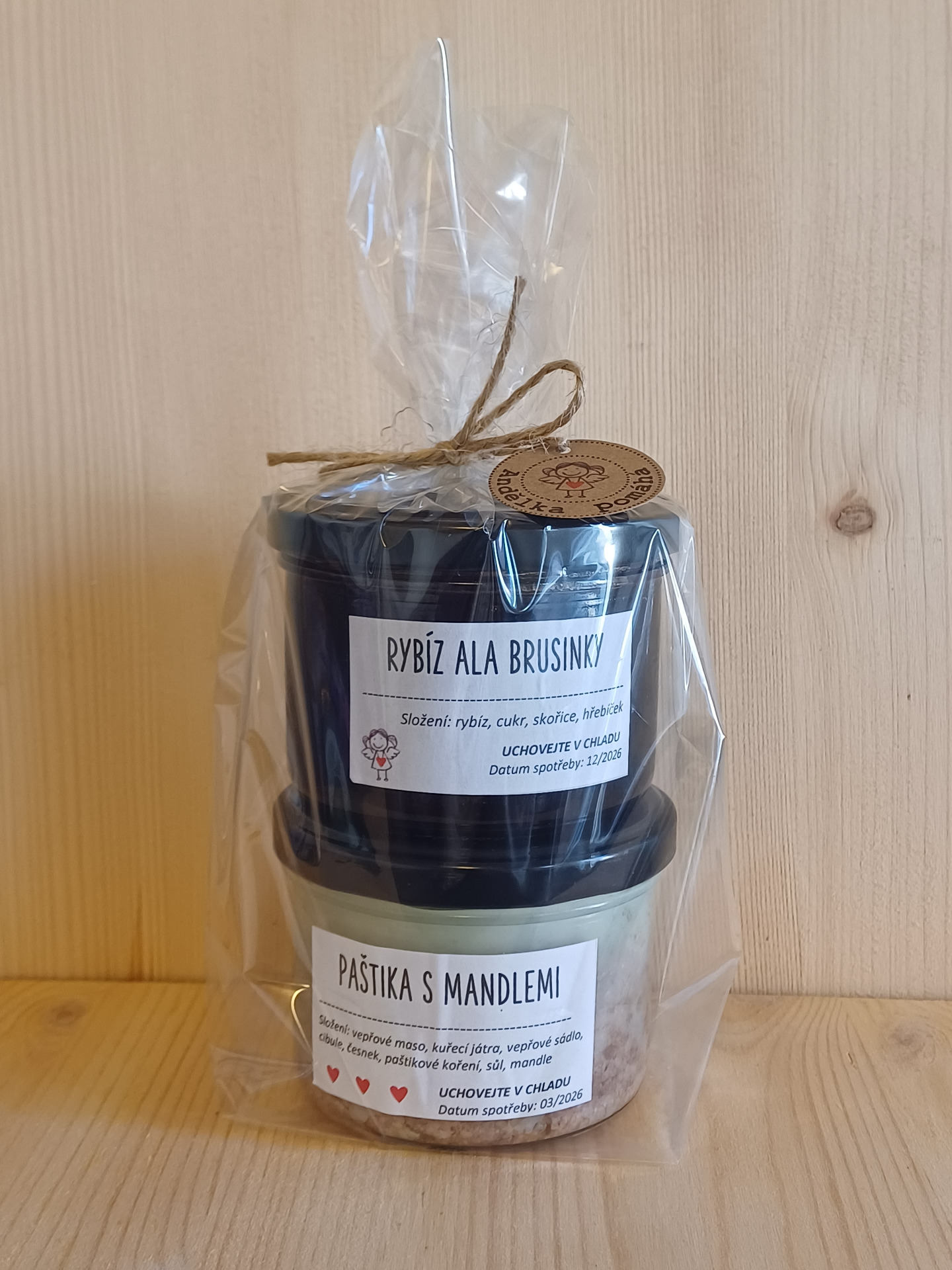 Dárkový balíček obsahuje paštiku s mandlemi a rybíz ala brusinky.