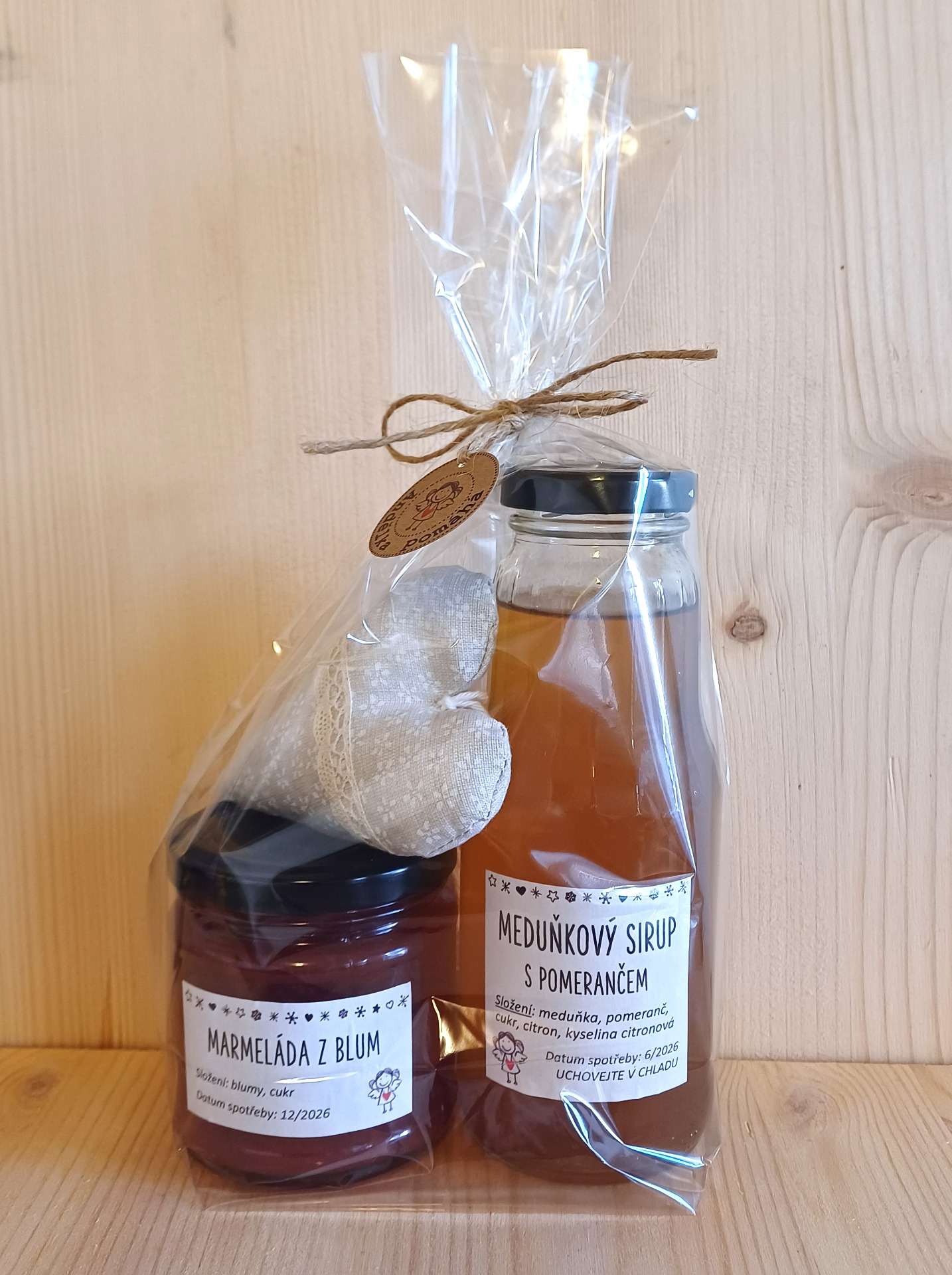Dárkový balíček obsahuje domácí meduňkový sirup s pomerančem, marmeládu z blum a krásné srdíčko pro radost.