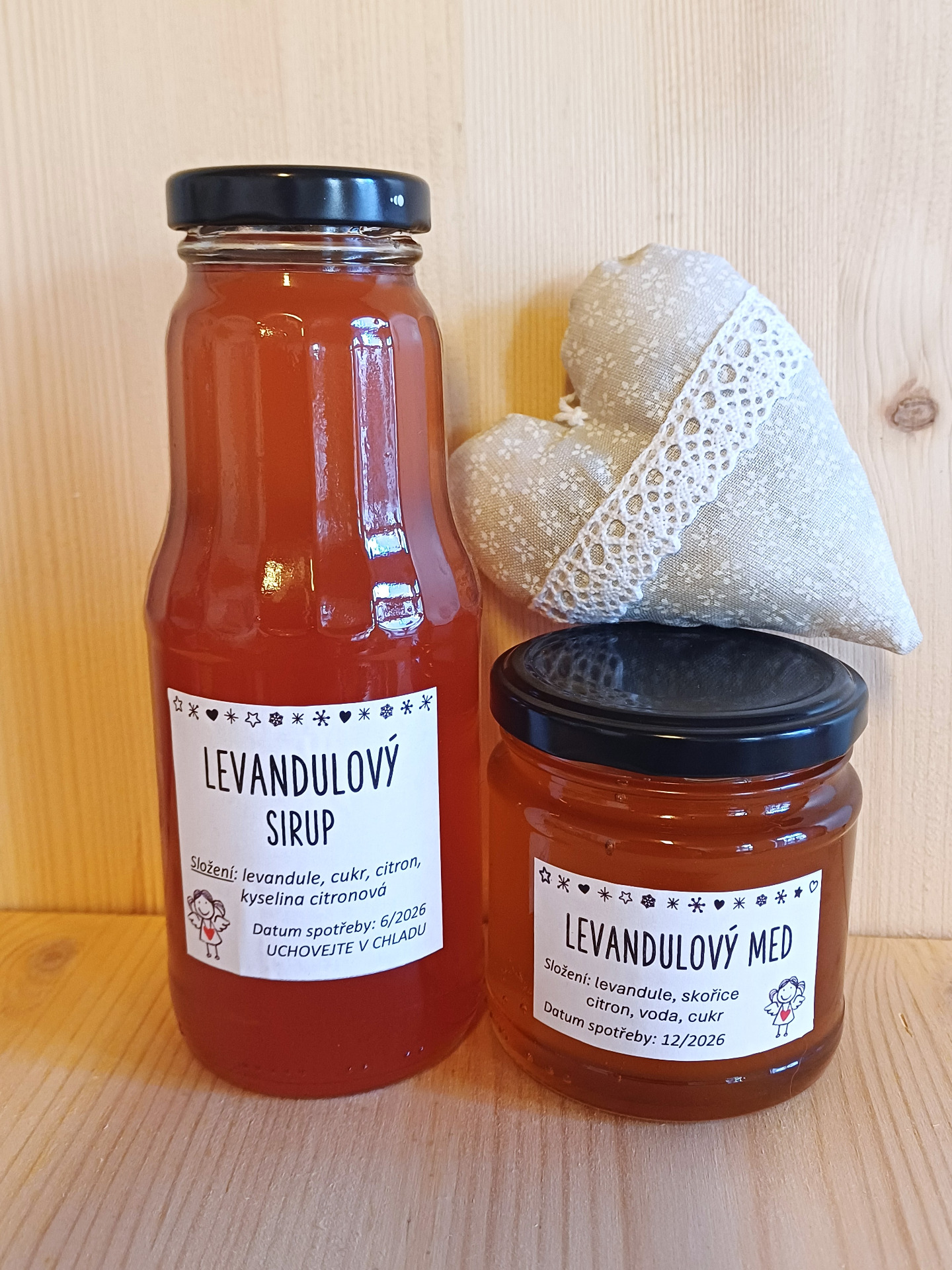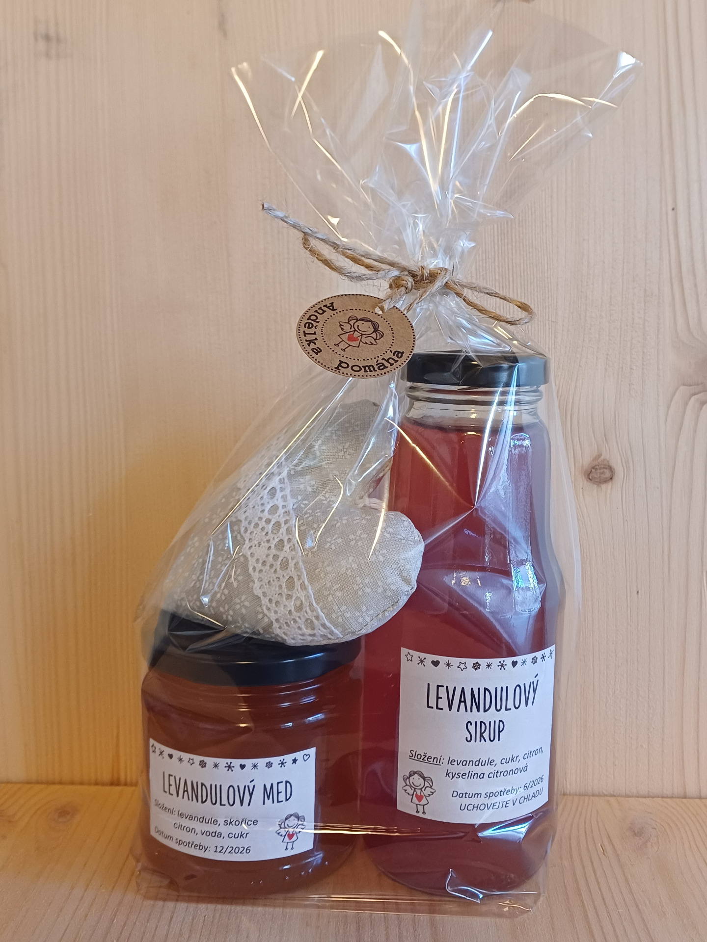 Dárkový balíček obsahuje domácí levandulový sirup, levandulový med a voňavé srdíčko naplněné sušenou levandulí.