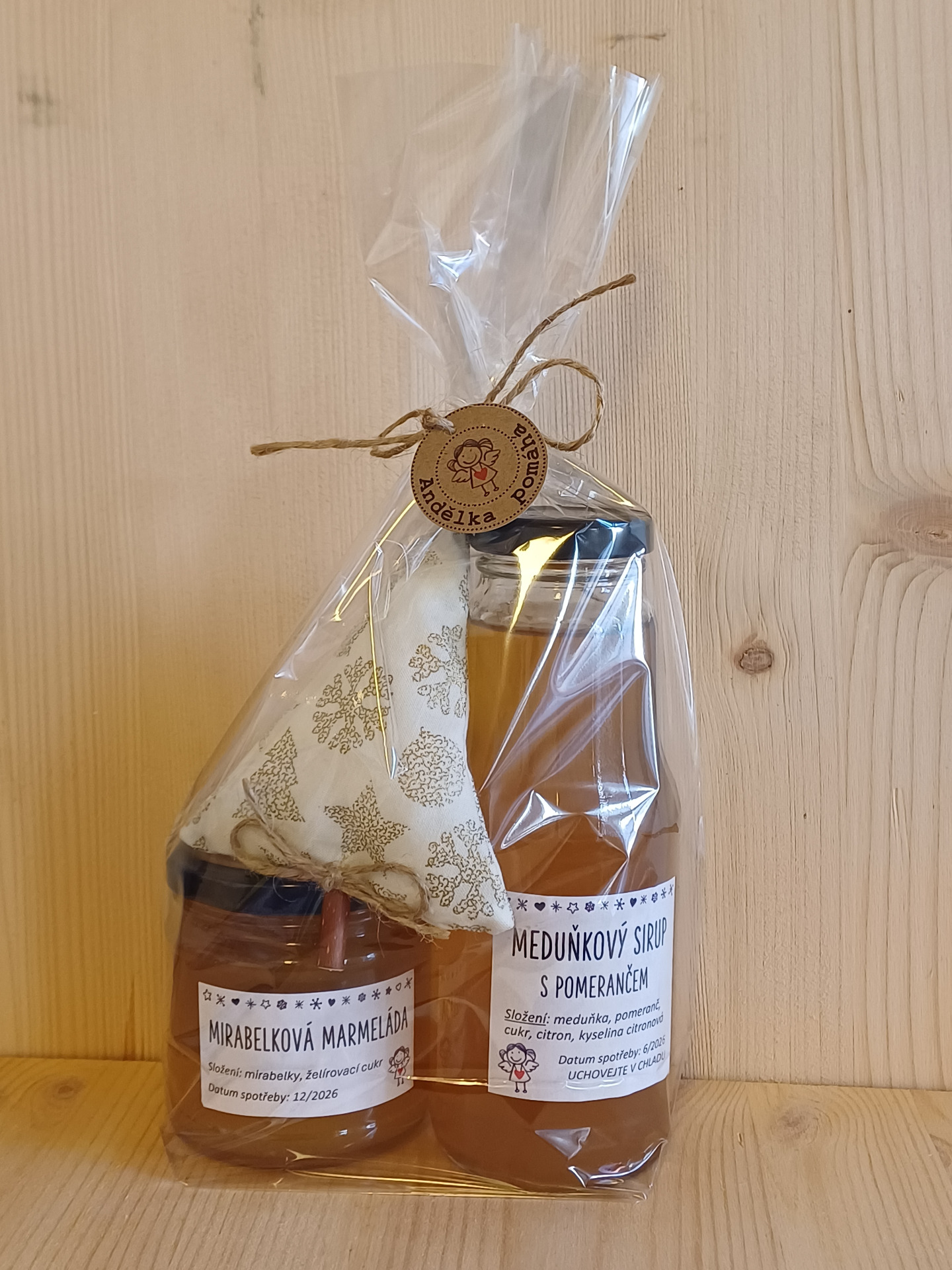 Dárkový balíček obsahuje domácí meduňkový sirup, marmeládu z mirabelek a krásný látkový stromeček pro radost.