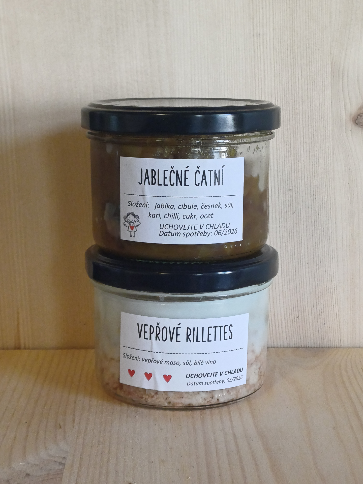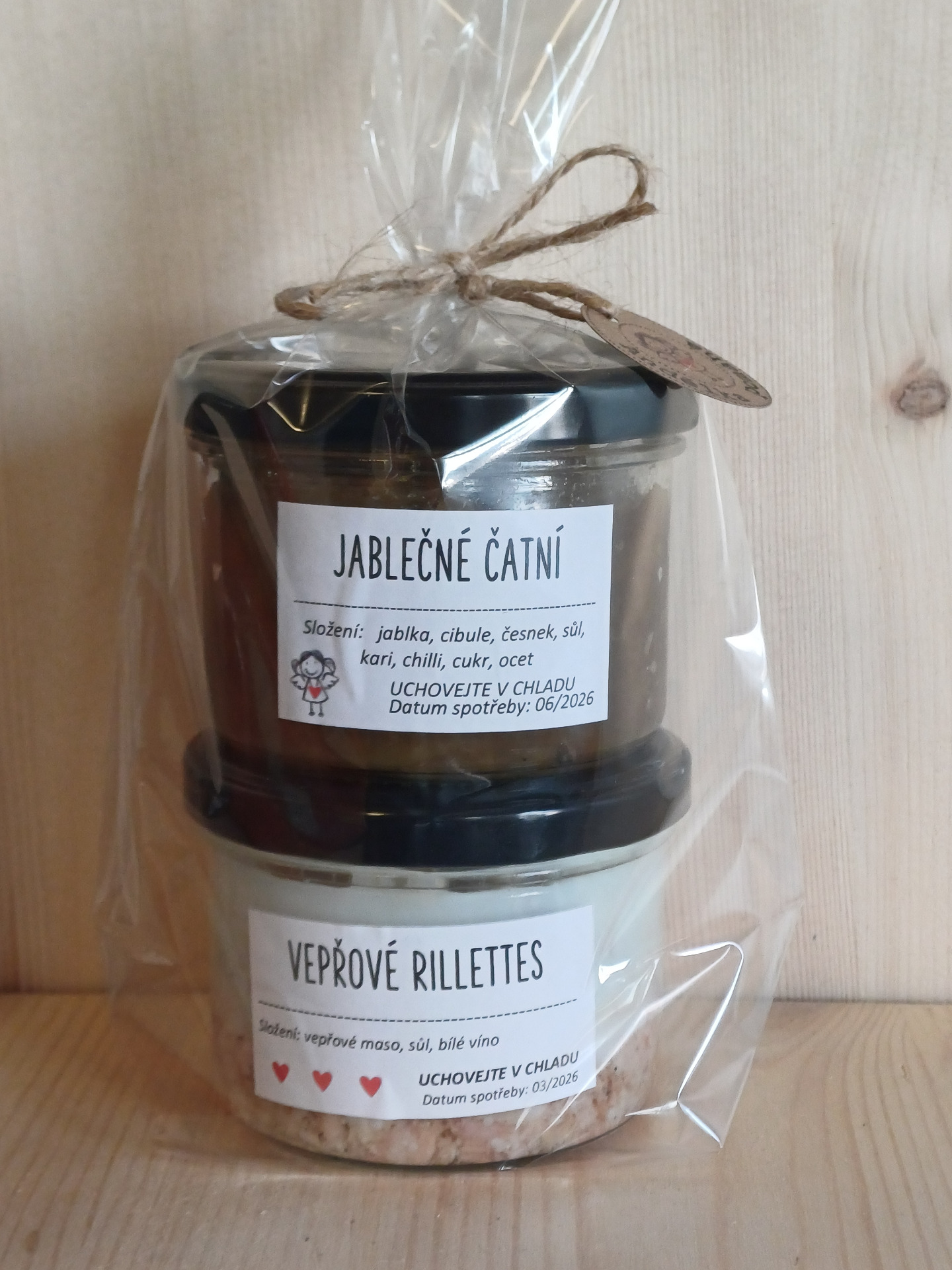 Dárkový balíček obsahuje vepřové rilletes a jablečné čatní.