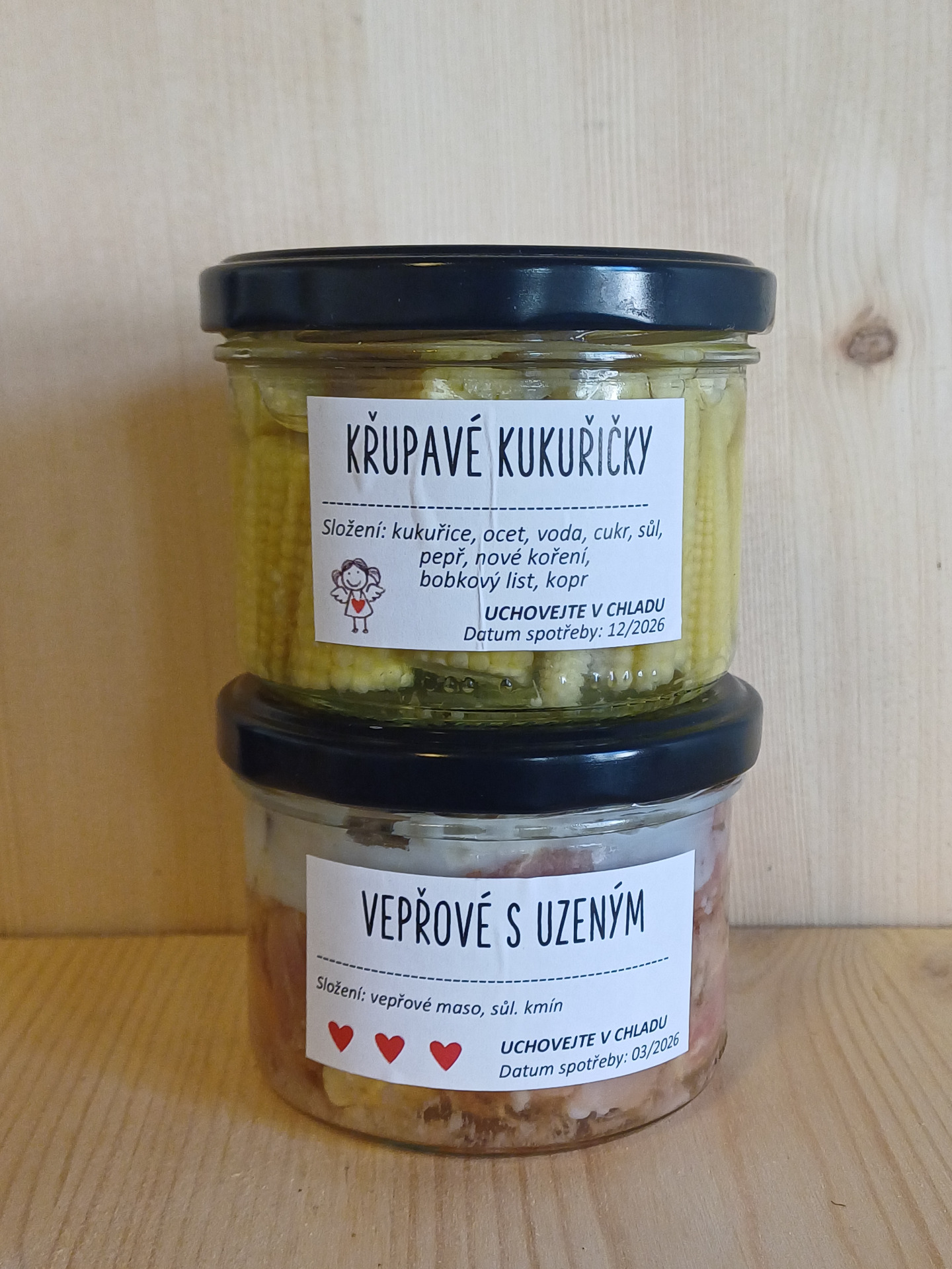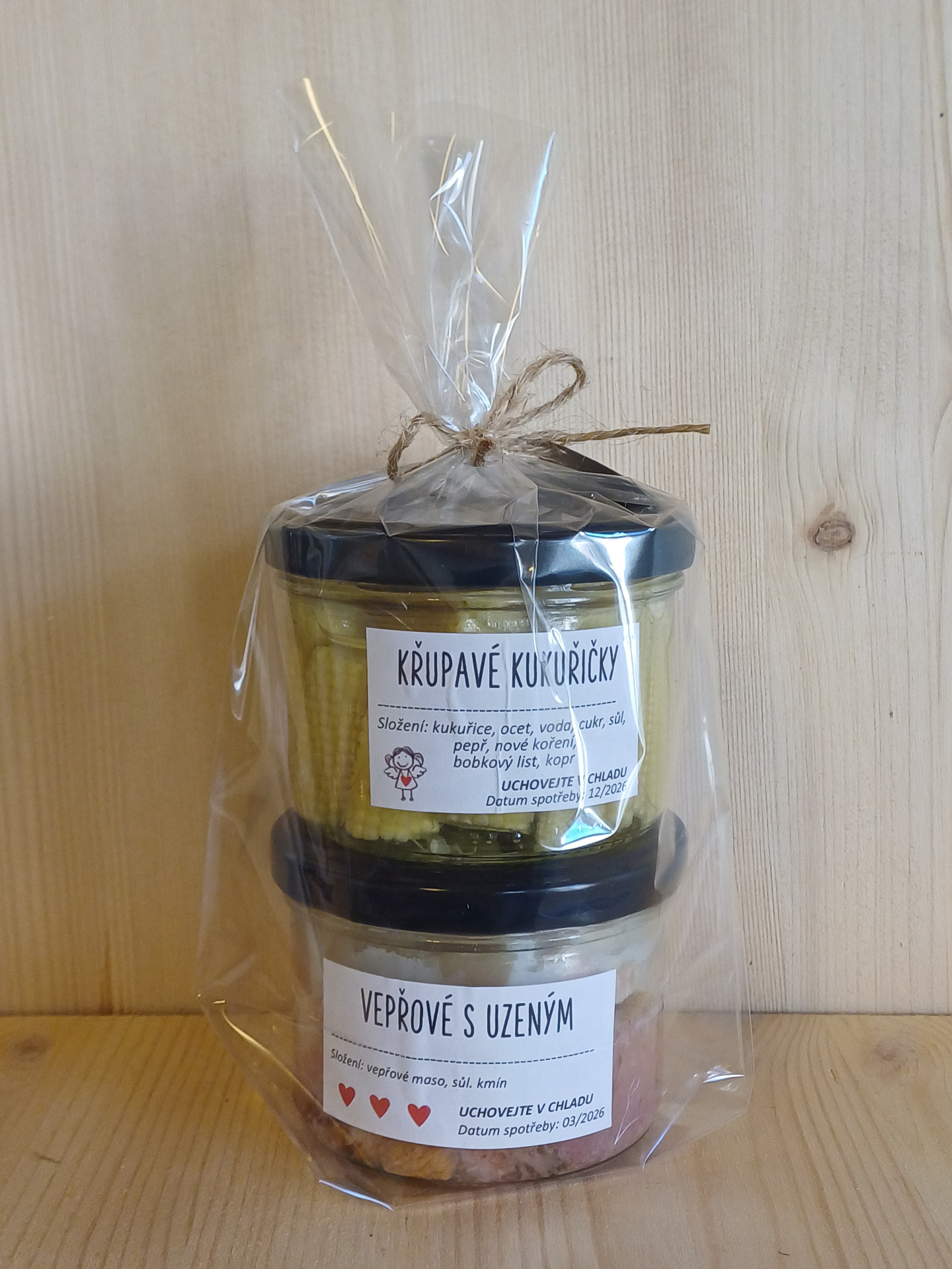 Dárkový balíček obsahuje vepřové maso s uzeným a kukuřičky.