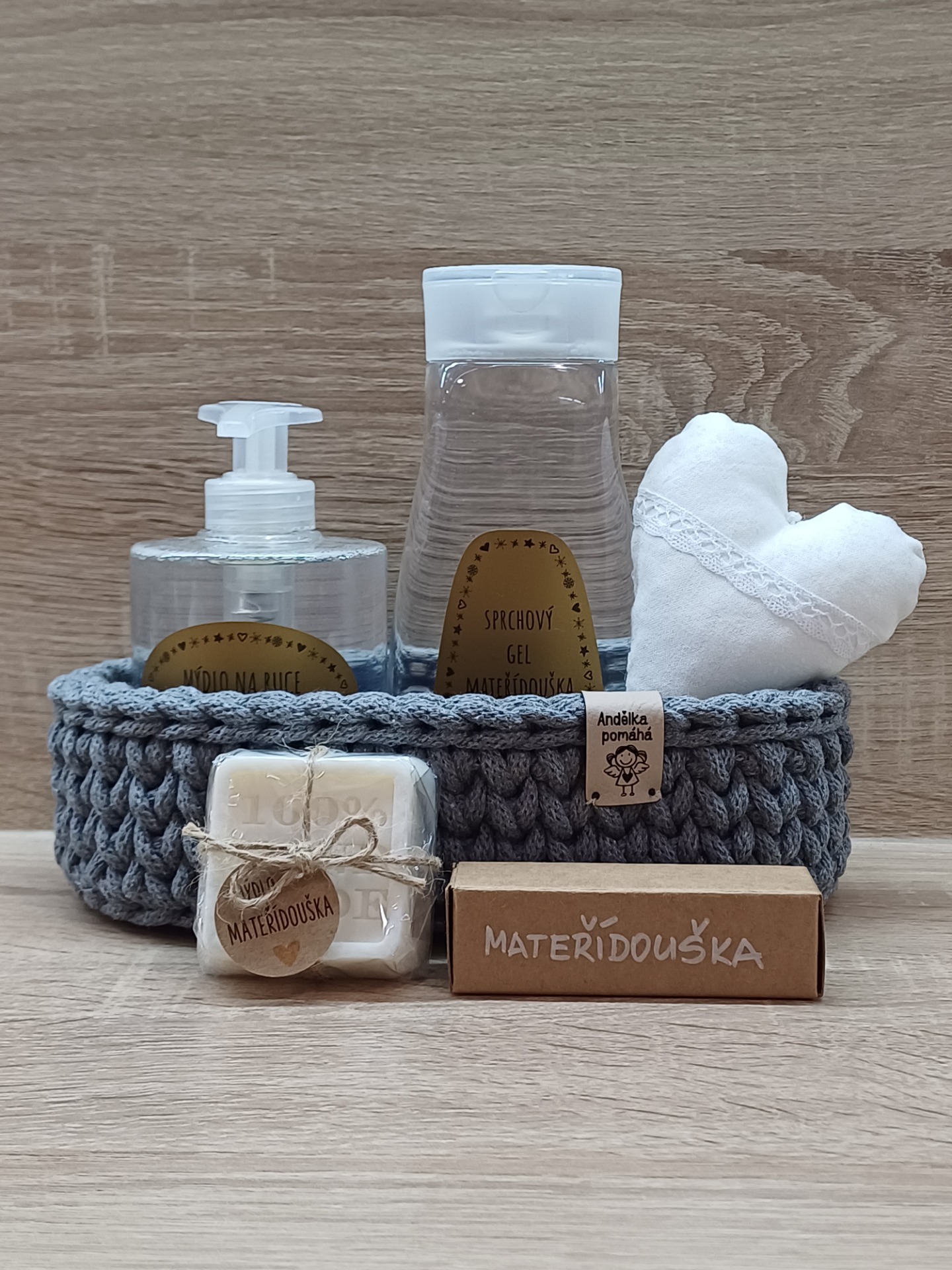 Háčkovaný oválný košík plný ručně vyrobené přírodní kosmetiky. Košík je v šedé barvě, má pevné dno z překližky a obsahuje tekuté mýdlo, sprchový gel, mýdlo, balzám na rty a bílé srdíčko.