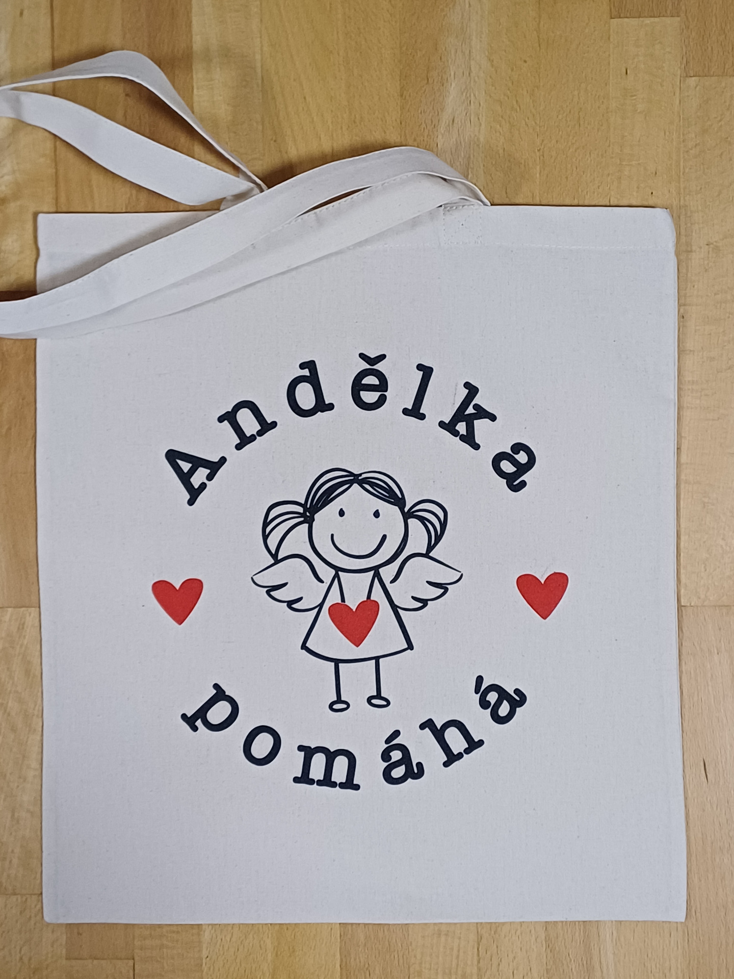 Krásná látková taška s naší Andělkou, která udělá radost každé dámě nosící domů nákupy. A to jsme všechny :-) Složená se krásně vejde do každé kabelky a budete ji mít pořád po ruce.