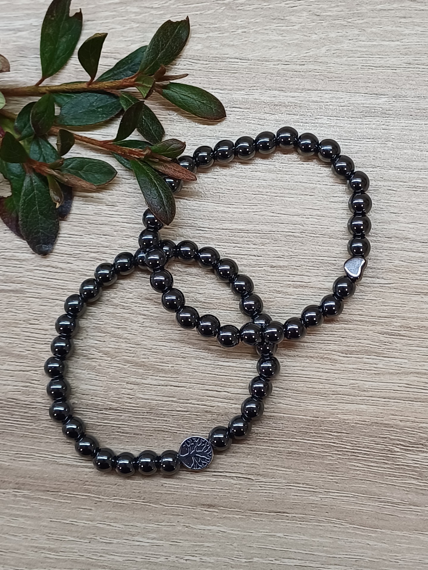 Minerální náramek z hematitu je doplněný malým srdíčkem nebo stromem života. Je navlečený na pevné pružence, průměr korálků je 6 mm.