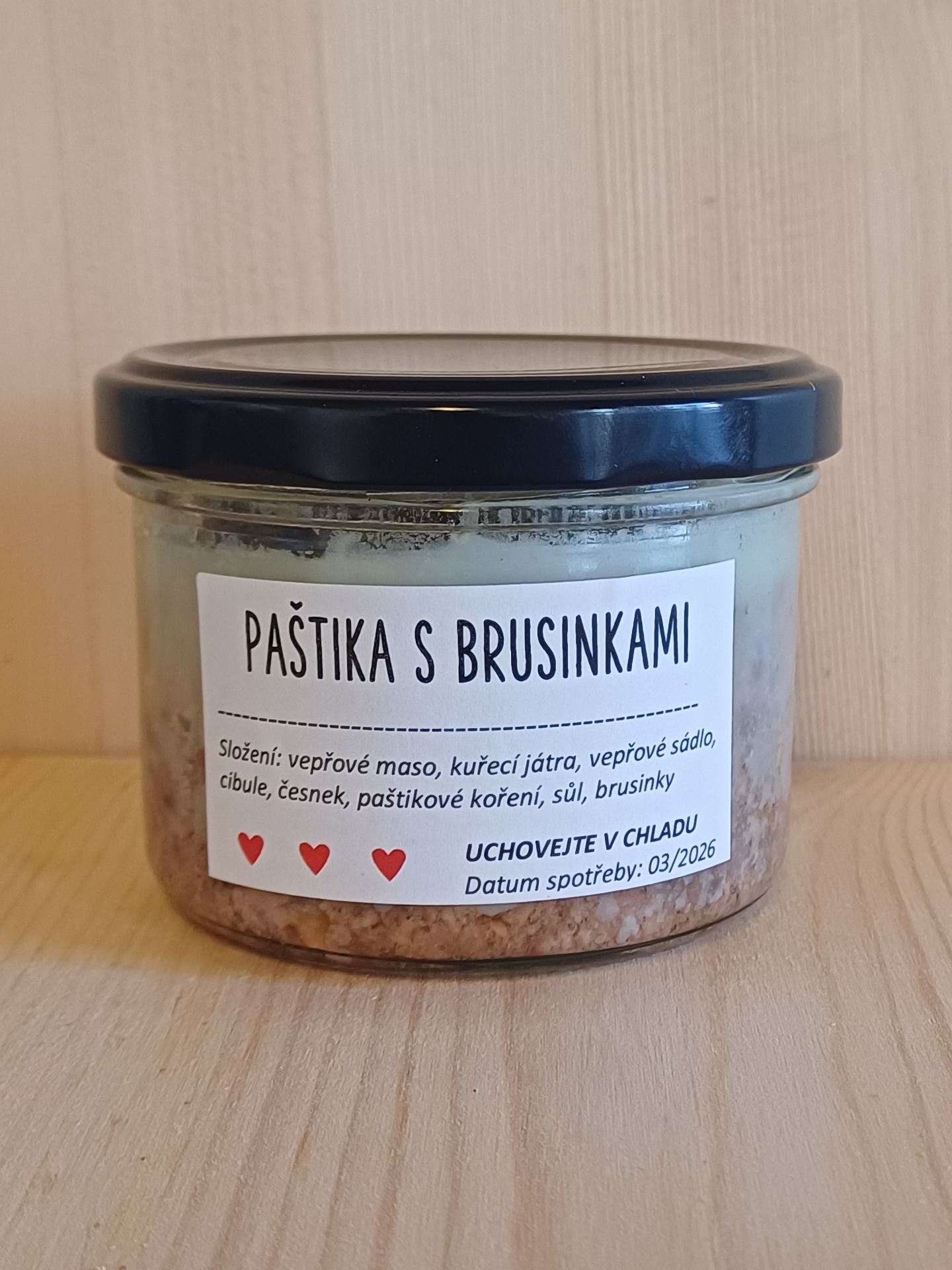 Vynikající domácí paštika vyrobená z vepřového masa, kuřecích jater a brusinek. Taková chuť se v obchodě nedá koupit. Paštika je bez alergenů a konzervačních látek.