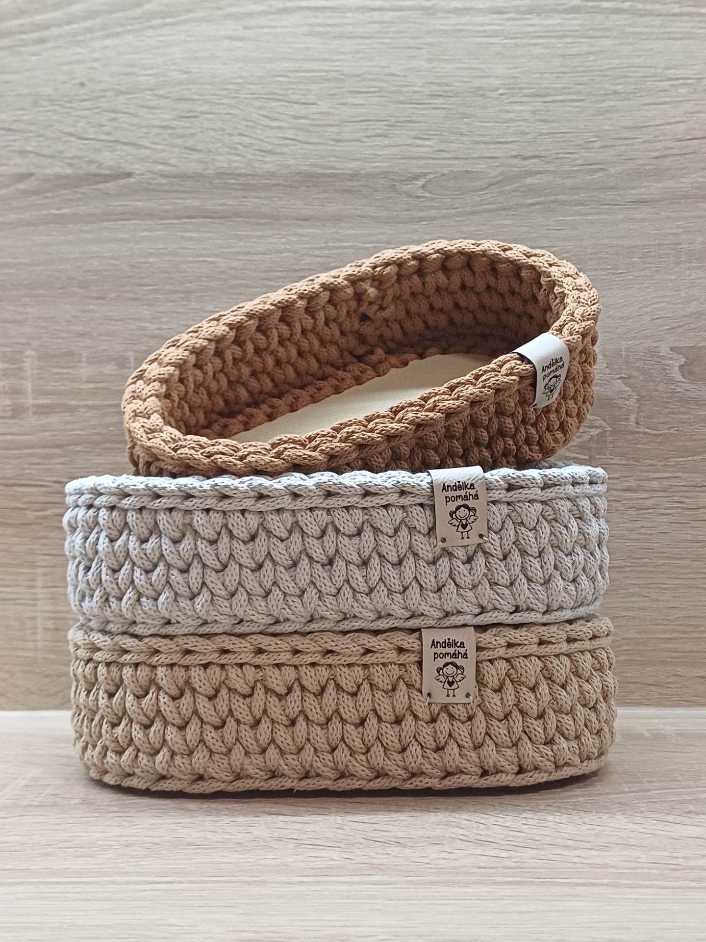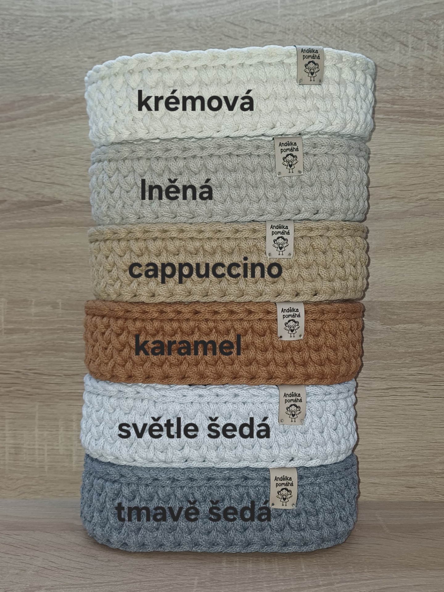 Tento s láskou háčkovaný košík je vyrobený z bavlněných šňůr, má pevné dno z překližky a je ozdobený štítkem s naší Andělkou.