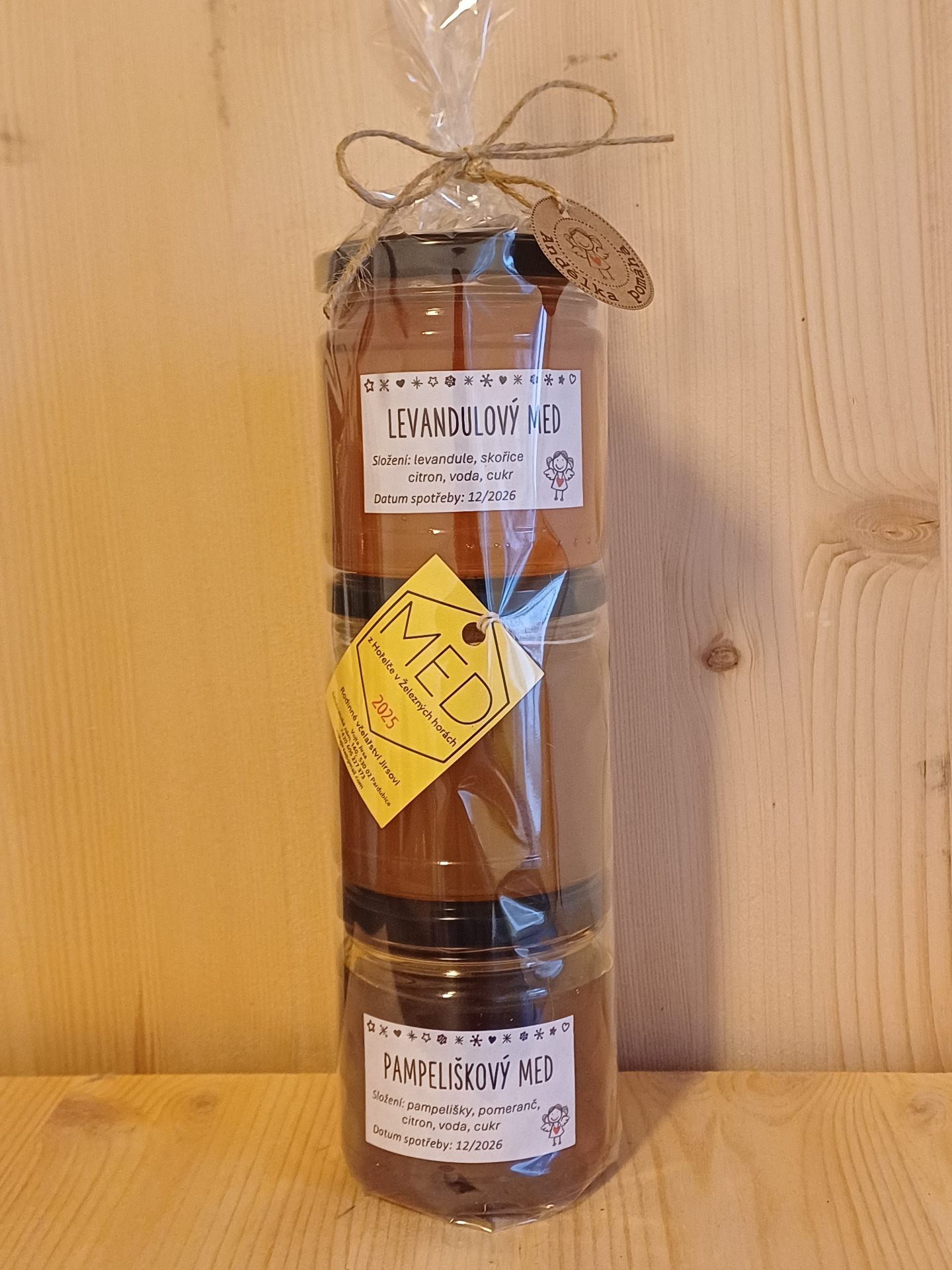 Krásně a s láskou zabalený balíček obsahuje tři druhy medu - včelí med od Jirsů, levandulový a pampeliškový med. Dárek, se kterým už nebudete mít žádnou práci.