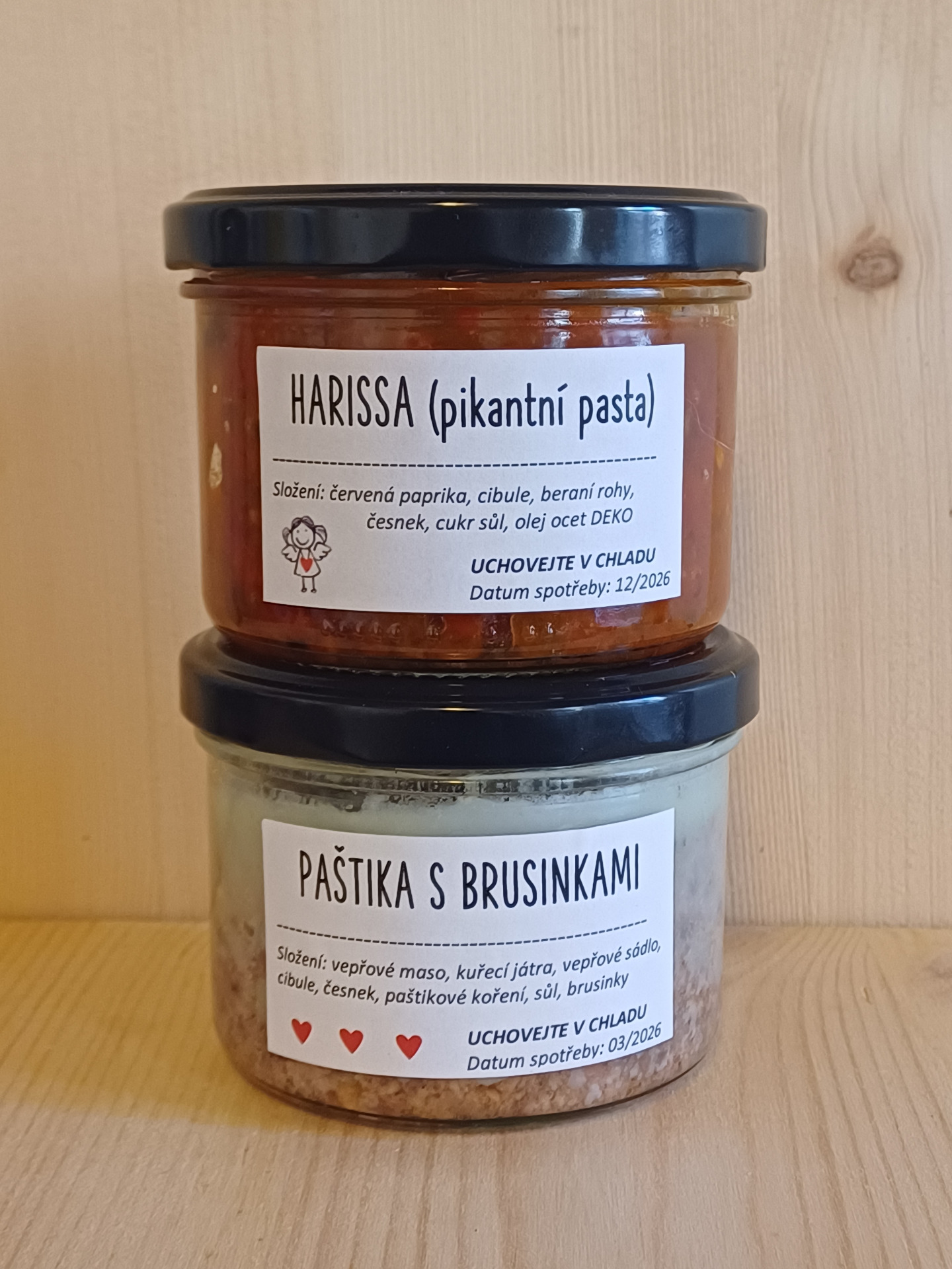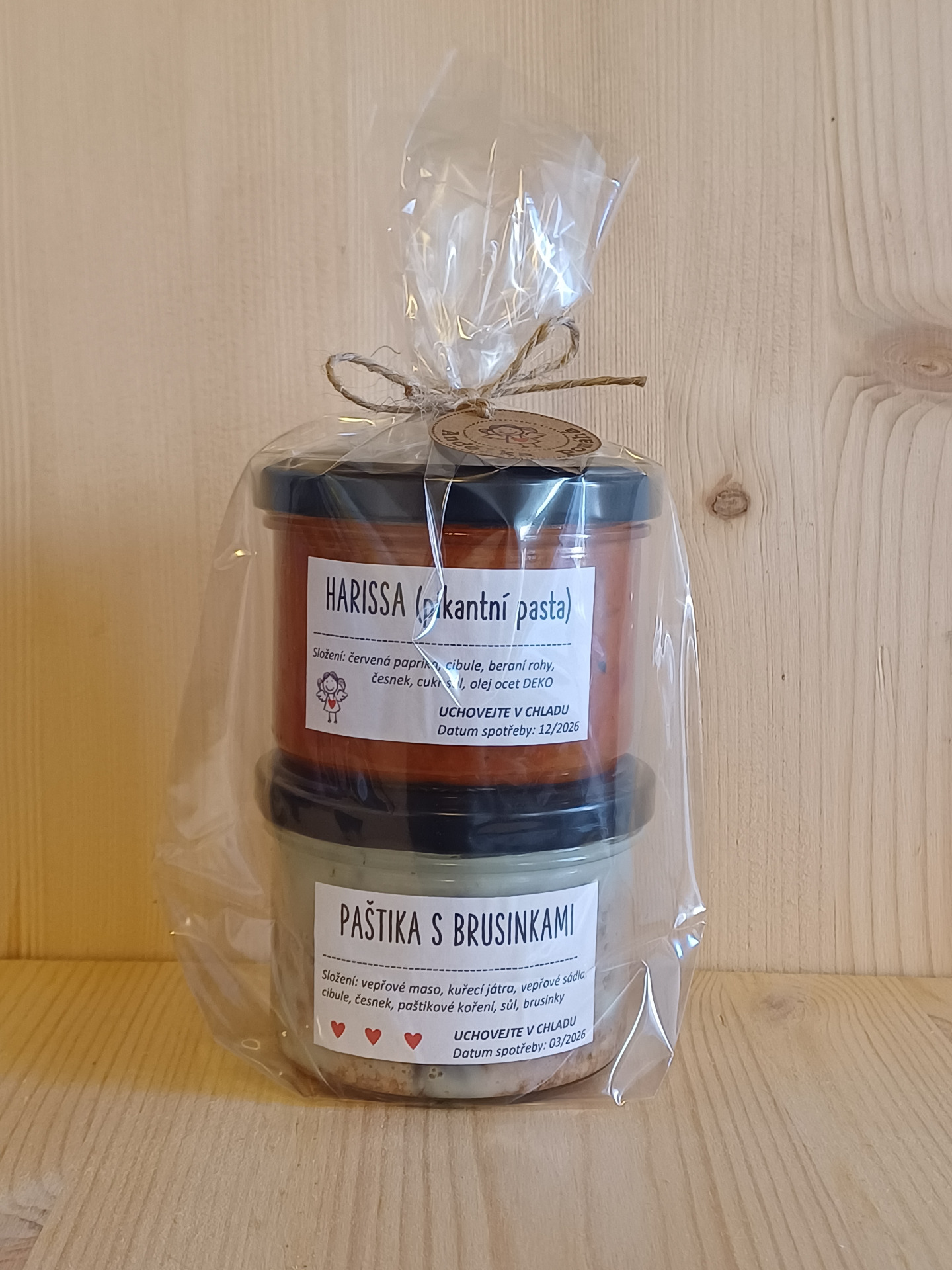 Dárkový balíček obsahuje paštiku s brusinkami a pikantní harissu.