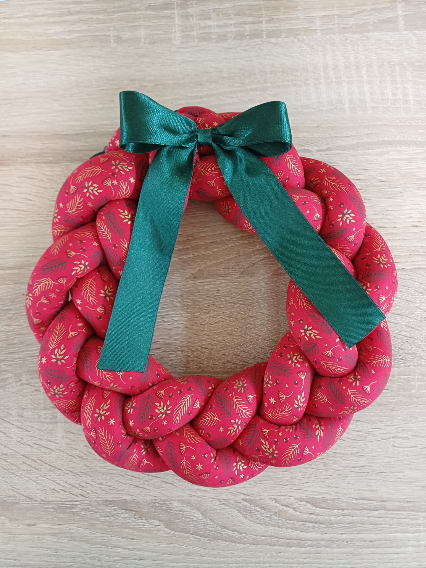 Látkový ručně šitý věnec s vánoční tématikou plněný dutým vláknem a ozdobený zelenou saténovou stuhou. Je opatřen poutkem na zavěšení.